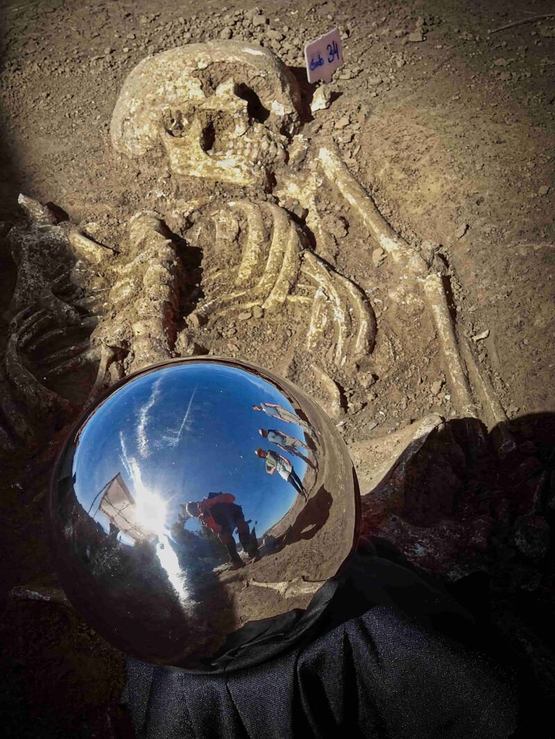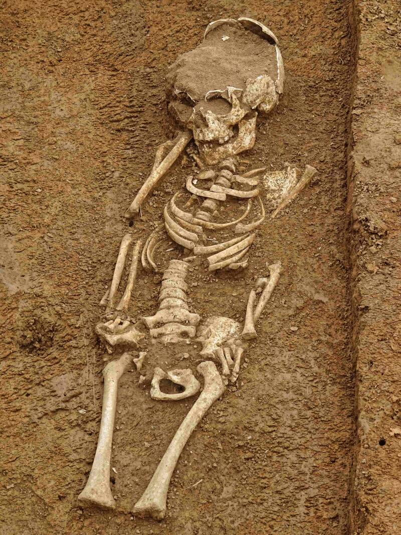 Funde im Gräberfeld (v.l.n.r.): Kind (8-10 Jahre) neben Erwachsenem - Oberschenkelhals - Säuglingsschädel zwischen den Beinen