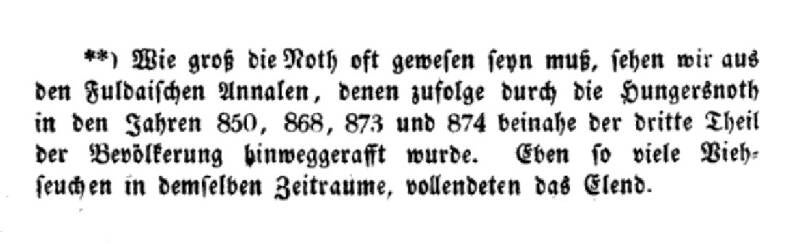 Die Lektüre der Fuldaer Annalen liefert eine gut dokumentierte Reihe von Sonnenfinsternissen, Naturkatastrophen und deren Auswirkungen auf die Landwirtschaft. So brachte der strenge Winter von 874 - der von November bis Ende März dauerte - Hunger und seuchen ins Land.